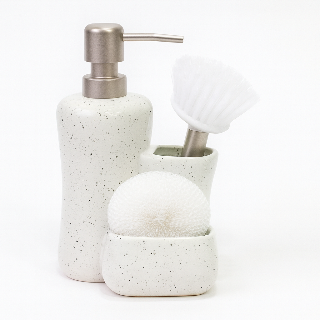 Upgrade your bathroom or kitchen sink with the 3 Pcs Attached Soap Dispenser Set (GP-11). This stylish and practical piece includes a liquid soap dispenser with built-in holders, keeping your essentials neatly organized. Available in Black and White Speckled finishes for a modern touch.