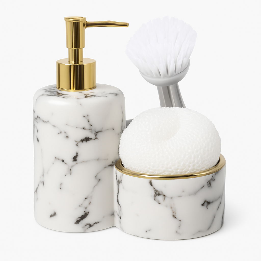 Keep your sink area clean and stylish with the 3 Pcs Attached Soap Dispenser Set (GP-08). Featuring a marble finish in Black-Gold and White-Gold variants, this dispenser set includes a liquid soap pump, scrubber holder, and brush holder – making it perfect for both bathroom and kitchen use.
