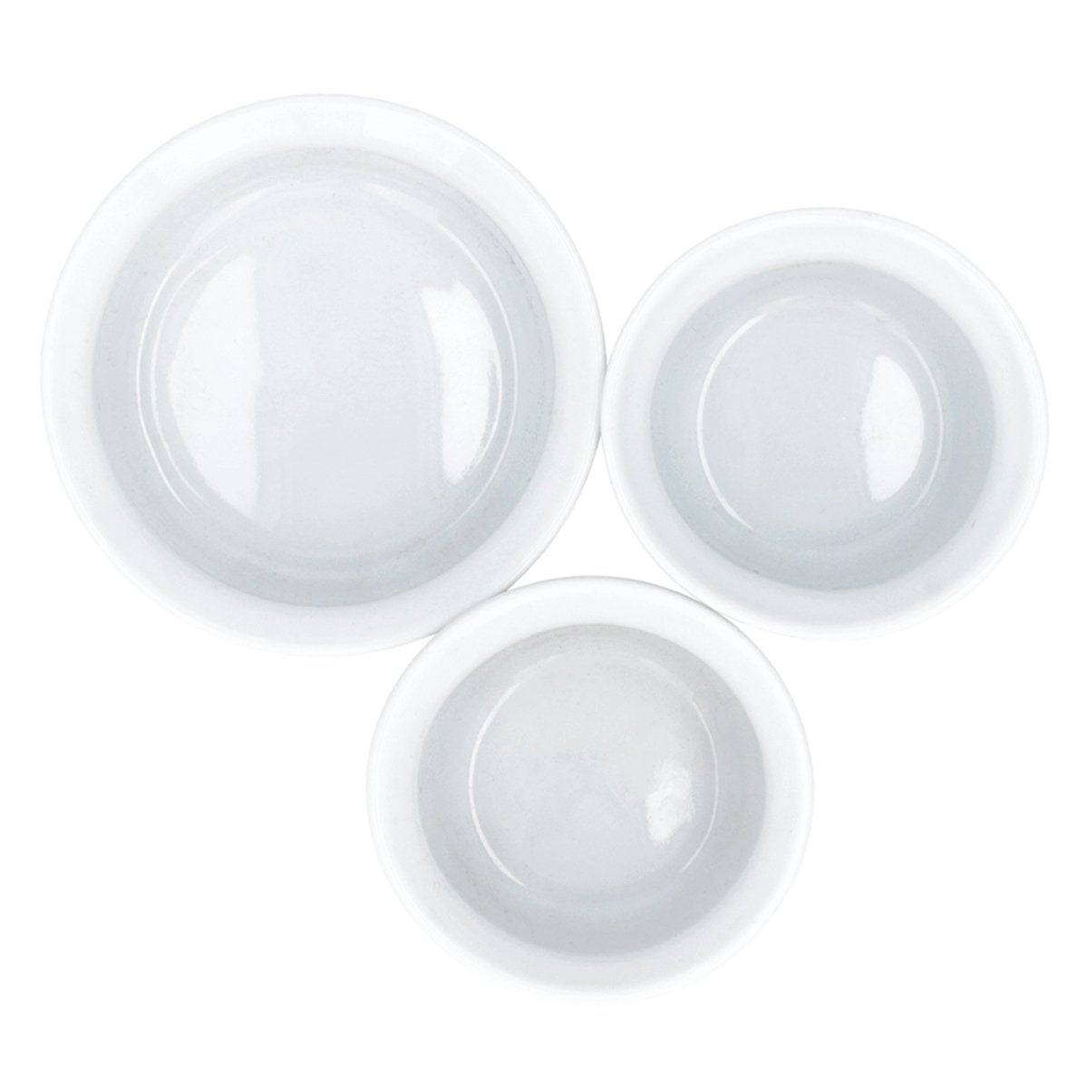 White ceramic sauce serving bowl in a set of 3. Serve dips and dressings with your dishes. Versatile and easy to clean. Alternative can be used for also baking creme brulee or pudding. Dimension In Inches: Width: 2, Height: 2, Depth: 2, Gross Weight (g): 0.16