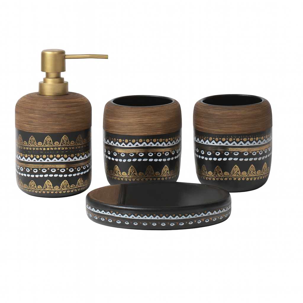Enhance your bathroom with the 4 Pcs Bathroom Set (GP-03), designed with a unique tribal-inspired ceramic pattern in two elegant colour options: white with earthy accents and black with gold detailing. Perfect for daily use while adding a warm, decorative touch.