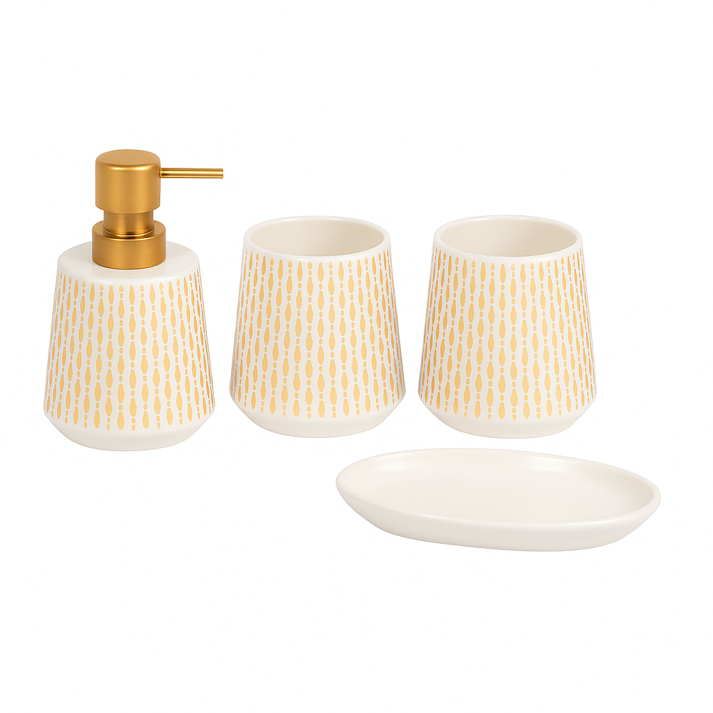 Bring a touch of elegance and functionality to your bathroom with the 4 Pcs Bathroom Set (JH-06). Available in two stunning colour options (White & Black with Gold Accents), this ceramic set combines durability with a contemporary cut-out design, making it an ideal choice for stylish bathrooms.