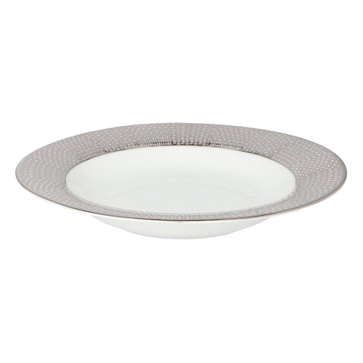 Dazzling metallic silver stripe border with abstract geometric printed design on white color round deep plates. Made with high-quality ceramic. Ideal for meals and house dinner servings. Dimension In Inches: Width: 9, Height: 1, Depth: 9, Weight (kg): 0.4
