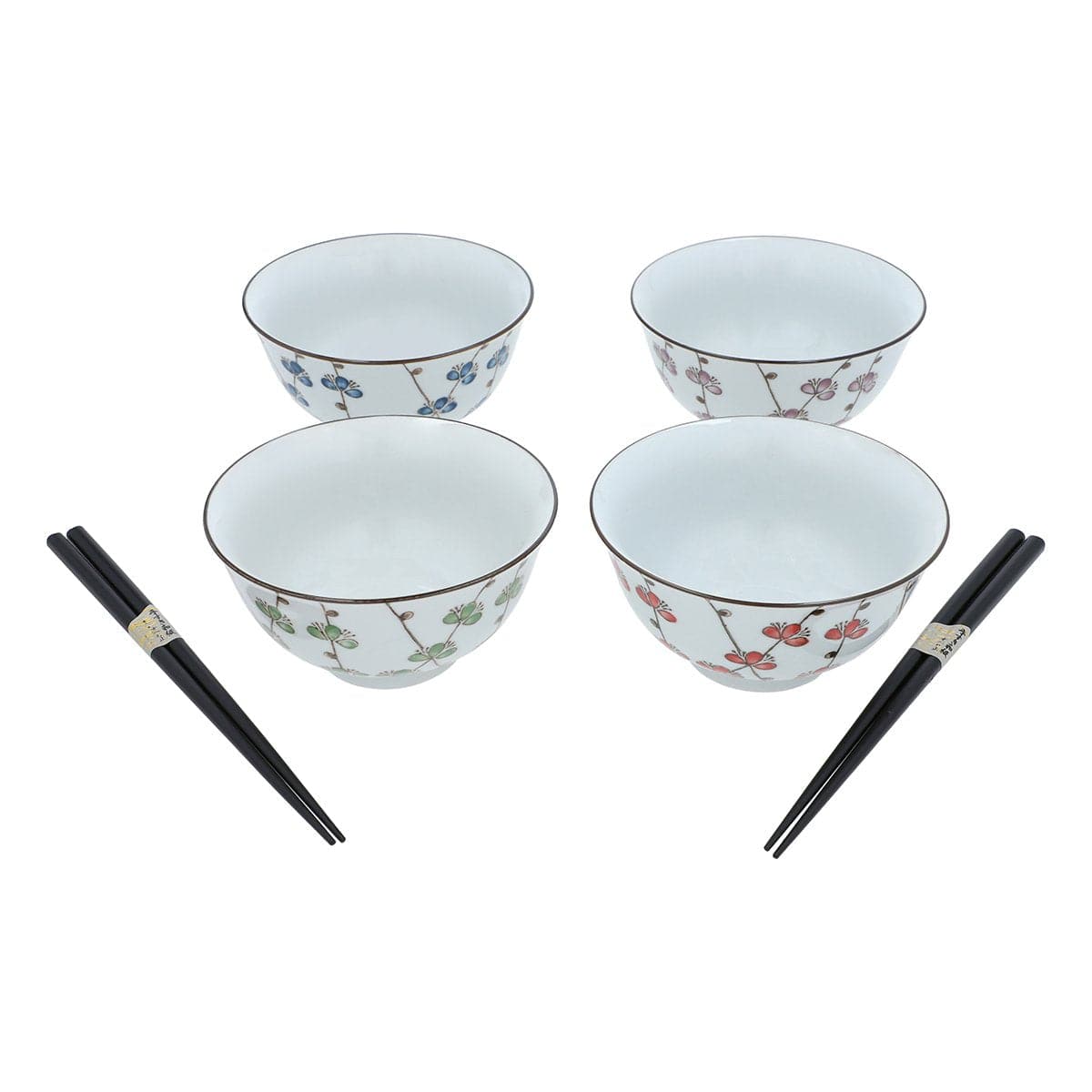 Charming floral Chinese bowl in a set of 5 with chopsticks. Made with high-quality ceramic. Serving instant or homemade soup, noodles and any oriental dishes with this charming serve ware. Creative design, different colors of bowl body & edge, and different colors outside. Dimension In Inches: Width: 6, Height: 5, Depth: 11, Gross Weight (g): 1480