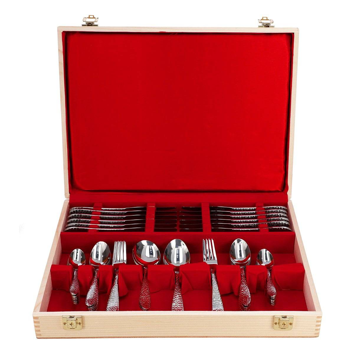 Embellish your dining table with this cutlery set. To bring convenience and luxurious feel. The spoons, forks and knives are specifically designed and trimmed for maximum comfort in hand. The cutlery is rust resistant, durable and long lasting. The cutlery is dishwasher safe. Comes along with beautiful delicate box. Dimension In Inches: Width: 3, Height: 14, Depth: 19, Gross Weight (g): 4.9