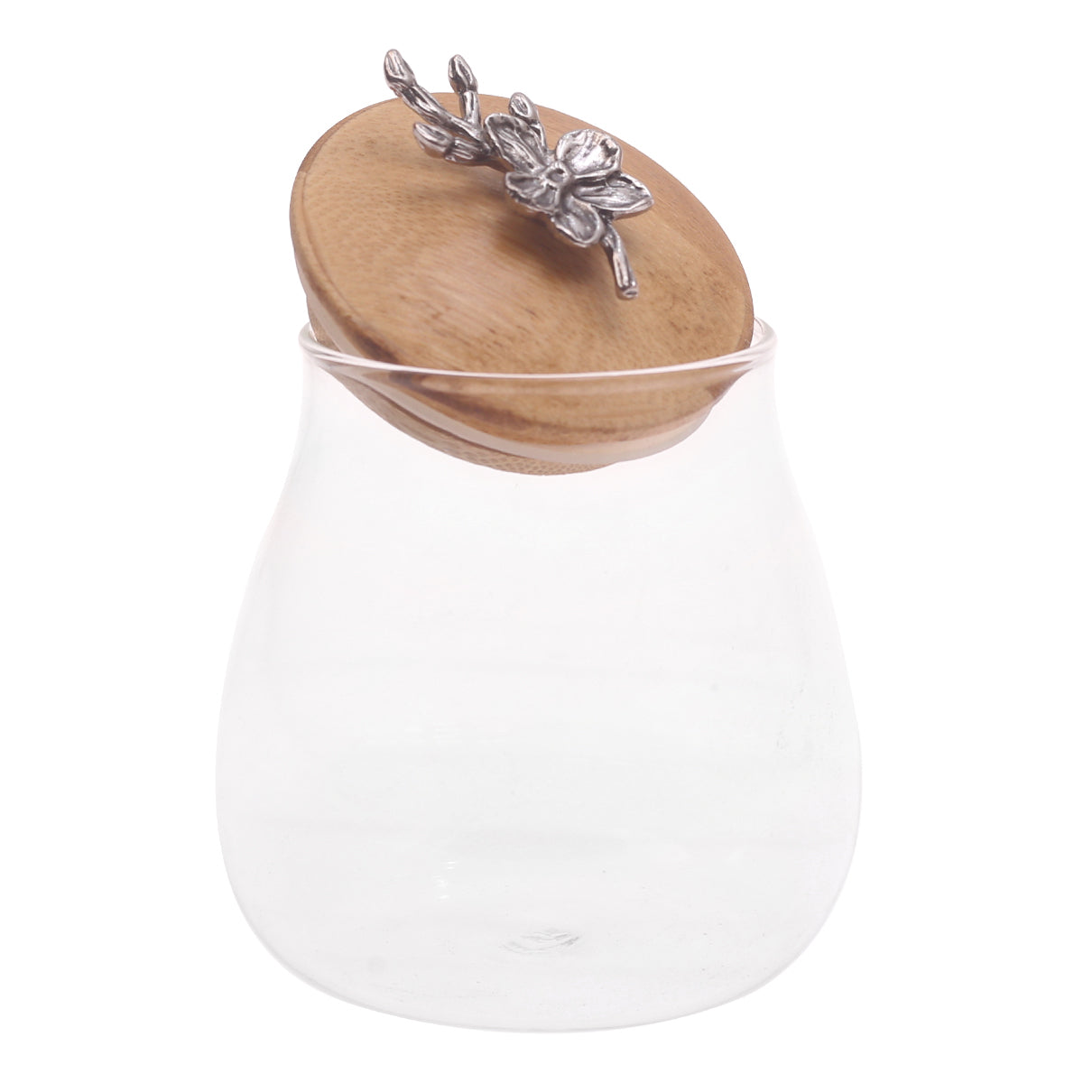 Add a touch of elegance to your kitchen or vanity with this small glass storage jar, beautifully crafted with a curved silhouette and topped with a natural wooden lid featuring a silver floral embellishment. Ideal for storing dry snacks, coffee, tea, or cotton pads, this jar brings both function and charm to any space.