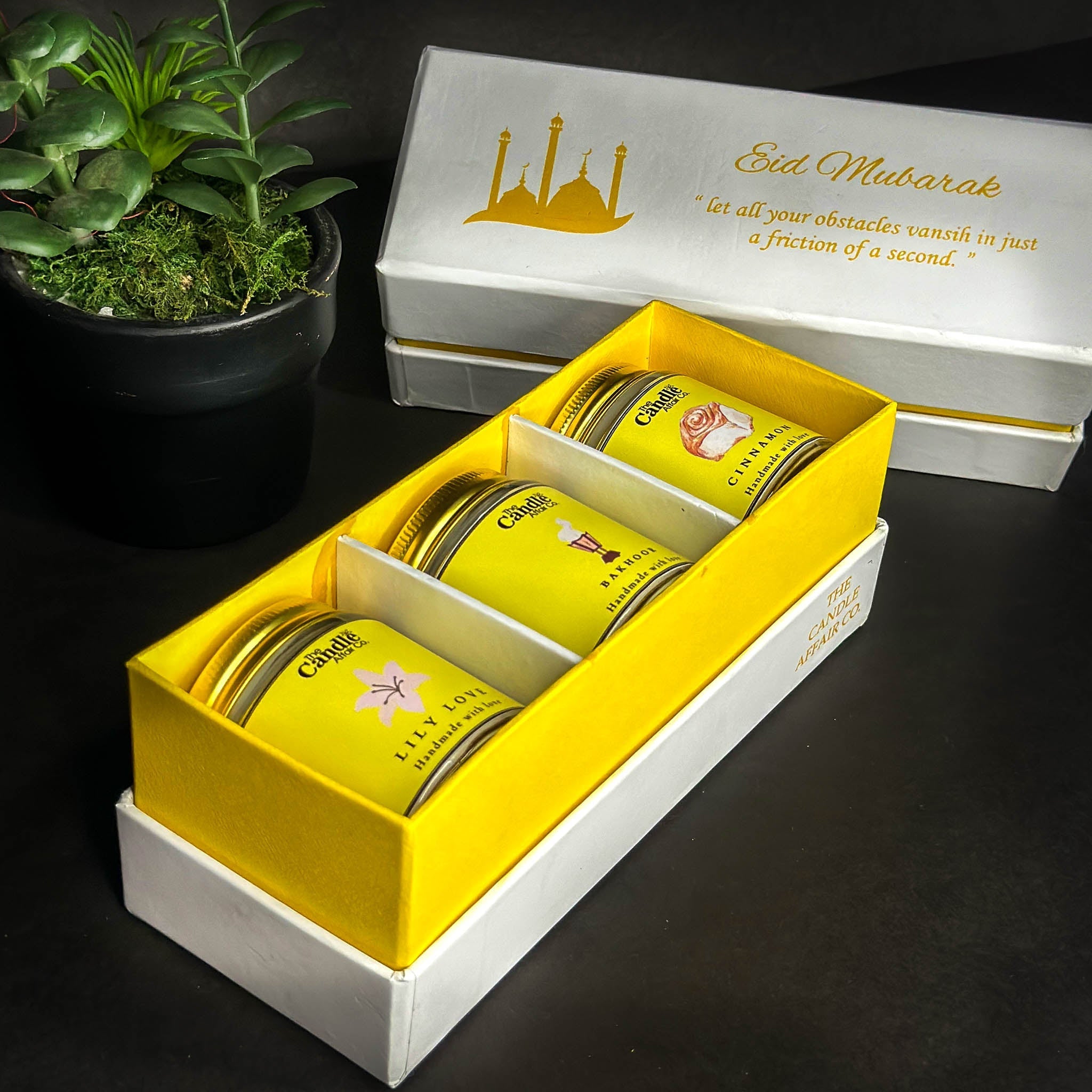 Introducing our exclusive Eid Mubarak Trio Box, a thoughtfully curated collection crafted to infuse your space with the spirit of celebration and joy. Experience the magic as you unwrap this trio of handcrafted scented candles, each chosen to embody the essence of Eid festivities.