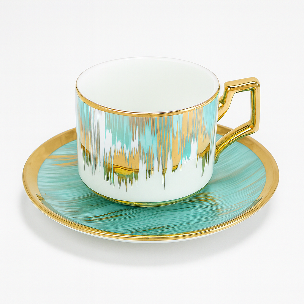 Design: Ceramic with gold-finished handle & rim